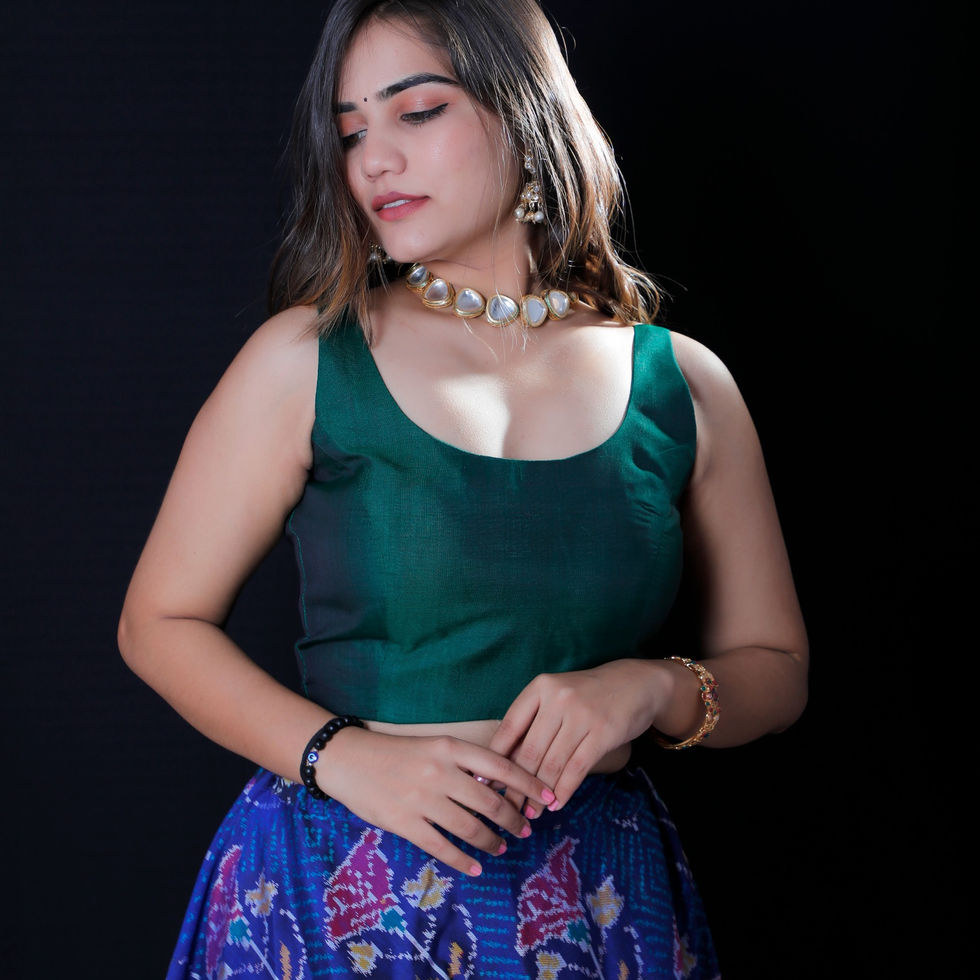 Each piece is a wearable work of art, woven by skilled artisans from Patan, taking weeks to complete just one blouse. The vibrant motifs and symmetrical patterns, characteristic of Patan Patola, make it a timeless classic. Perfect for pairing with sarees, lehengas, or as a contemporary fusion piece.